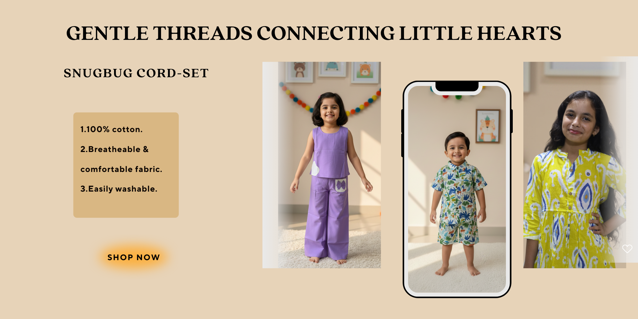 DreamyHearts Kids Pure Cotton Beige Full Sleeve Night Suit Set | SnugBug