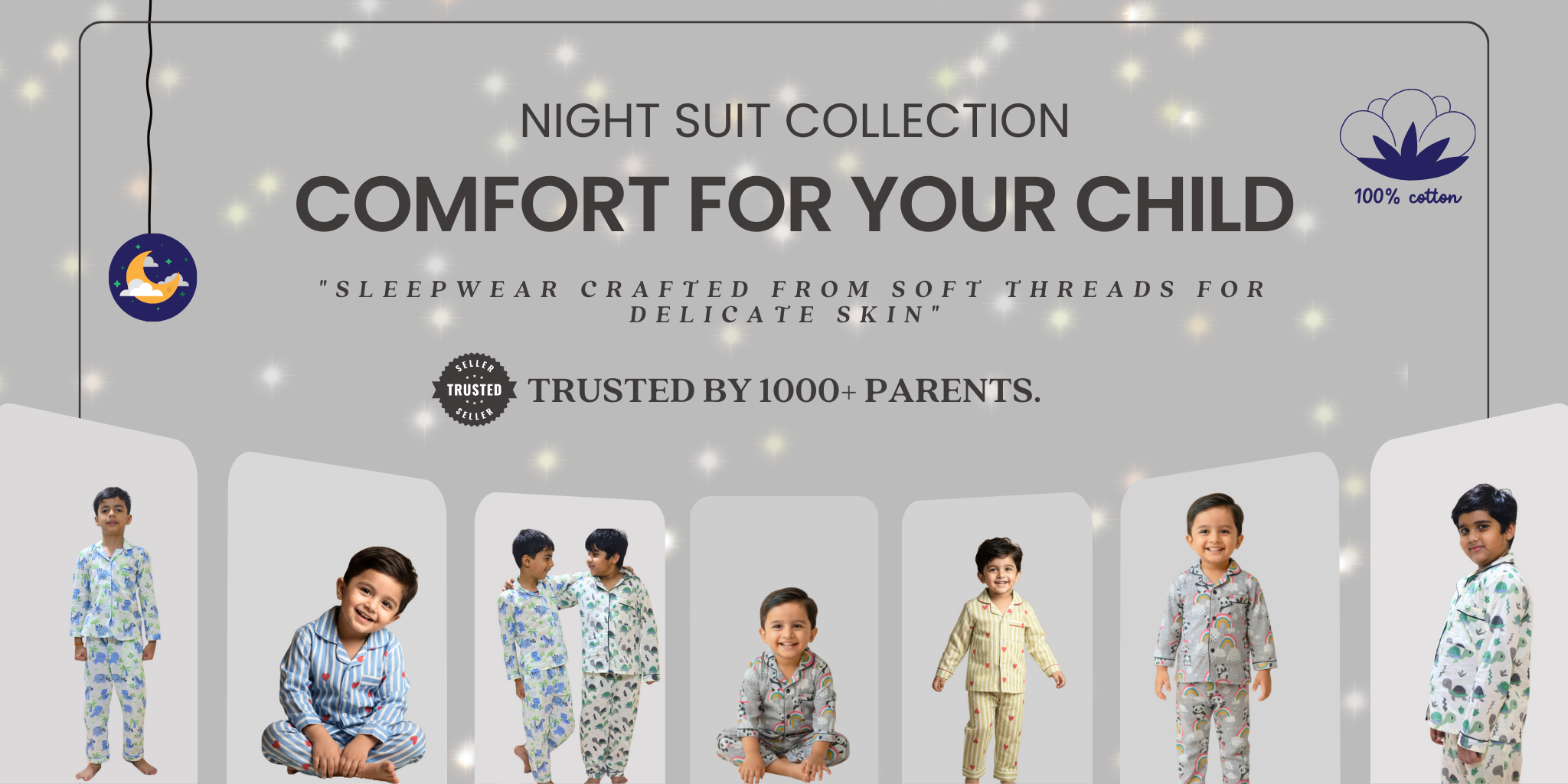 DreamyHearts Kids Pure Cotton Grey Full Sleeve Night Suit Set | SnugBug